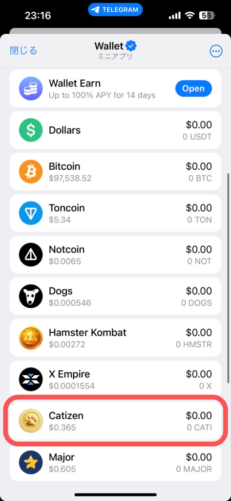 Telegramウォレットを使えば、CATIトークンの保有状況を即座にチェック。