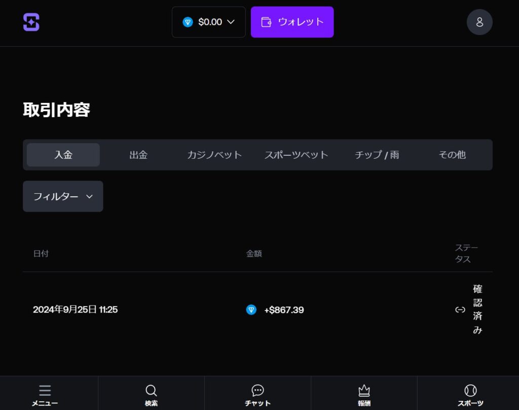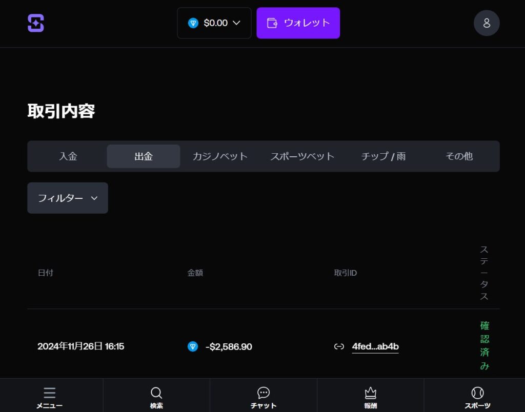 以下の画像と動画はシャッフルカジノ200%入金ボーナス利用時の入金額と賭け条件消化後の出金額となります。